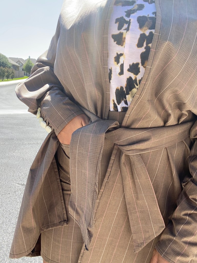 I love that this jacket doesn’t have any front buttons or zipper closure. This helps you to tightly tie the sash and accentuate the waist.