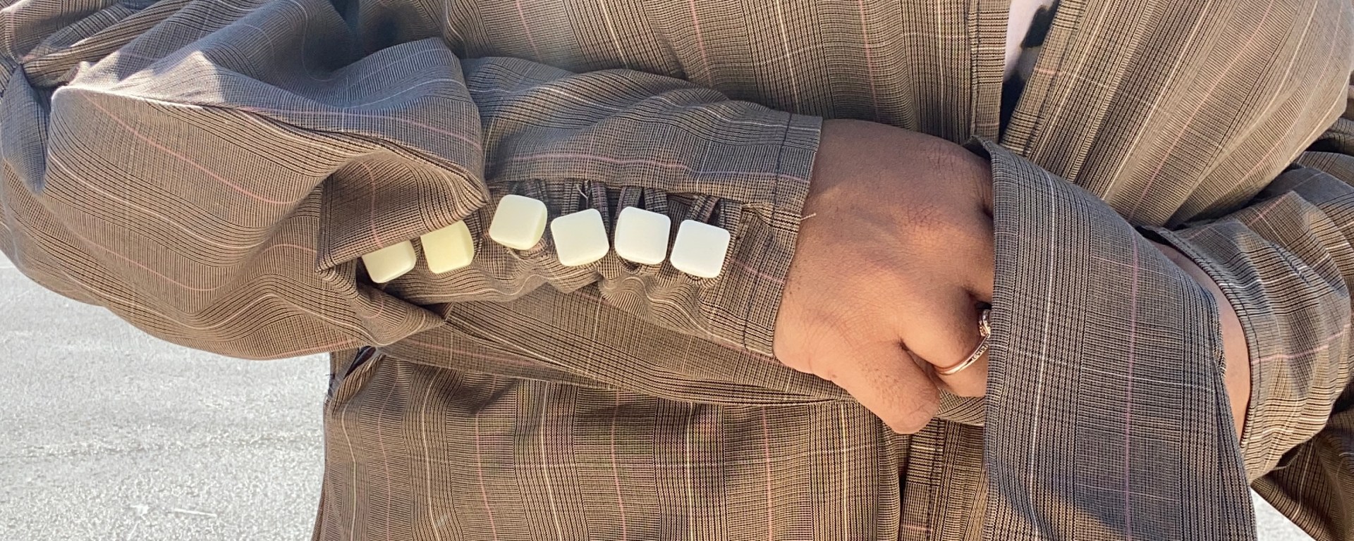 It’s made of a plaid print featuring colors of brown, tan, pink, ivory, and black. And the fact that it’s cotton makes it heavy enough to block the wind but light enough that you can still wear pieces under it without feeling too hot.